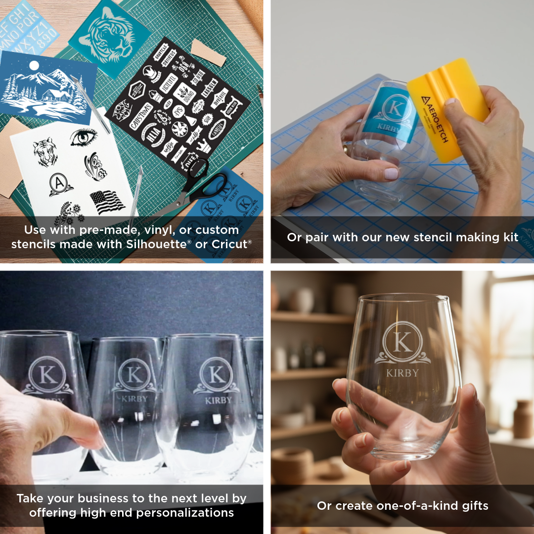 • Use popular stencil types like Cricut®, Silhouette®, and more—or upgrade with the Aero-Etch Stencil Making Kit to design your own custom stencils