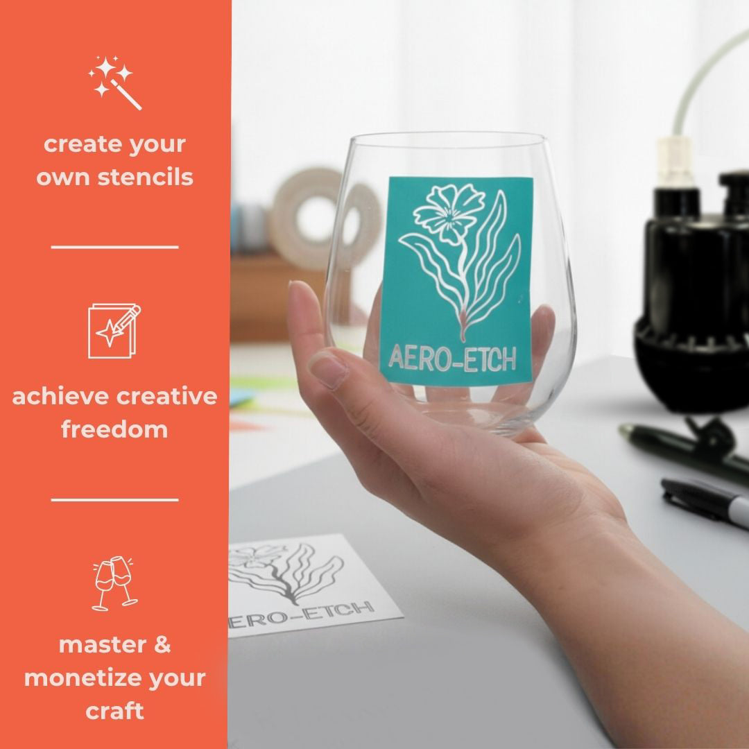 With the included Aero-Etch Stencil Making Kit, you can turn your own designs and photos into high-quality stencils, ready to use in your personal sandcarving setup.